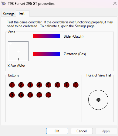 - Clicca su Proprietà per testare pulsanti e assi.