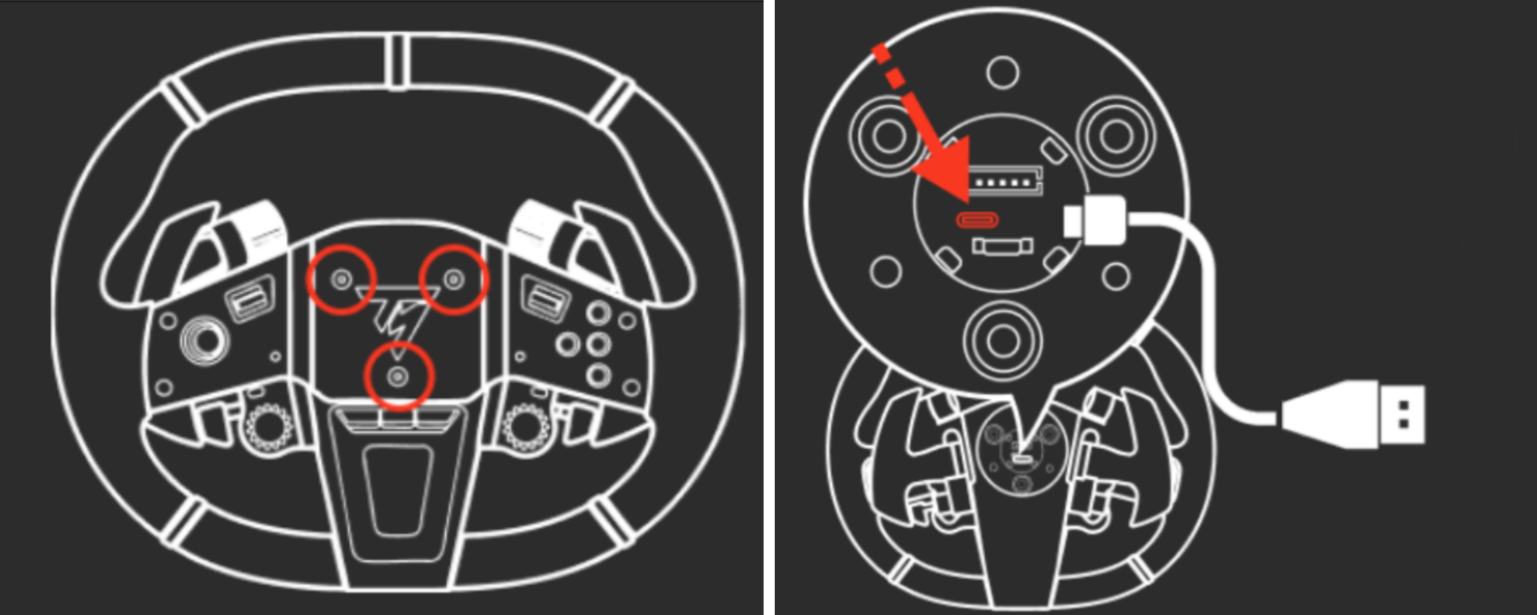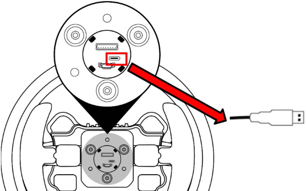 Open de connectorbehuizing om toegang te krijgen tot de USB‑C‑poort van uw stuurwiel-add-on. Wacht op de instructies voordat u de stuurwiel-add-on aansluit op de USB‑A‑poort van de pc.